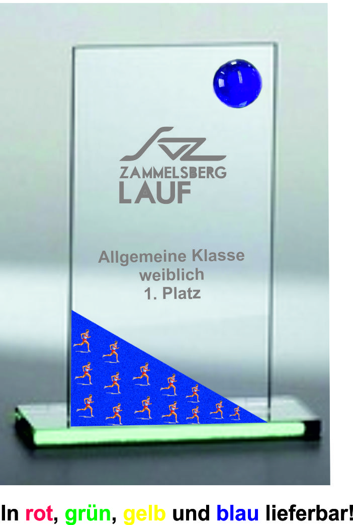 Moderne Glastrophäe in rot, grün, blau oder gelb lieferbar - 19 cm - Farbdruck oder Gravur inklusive